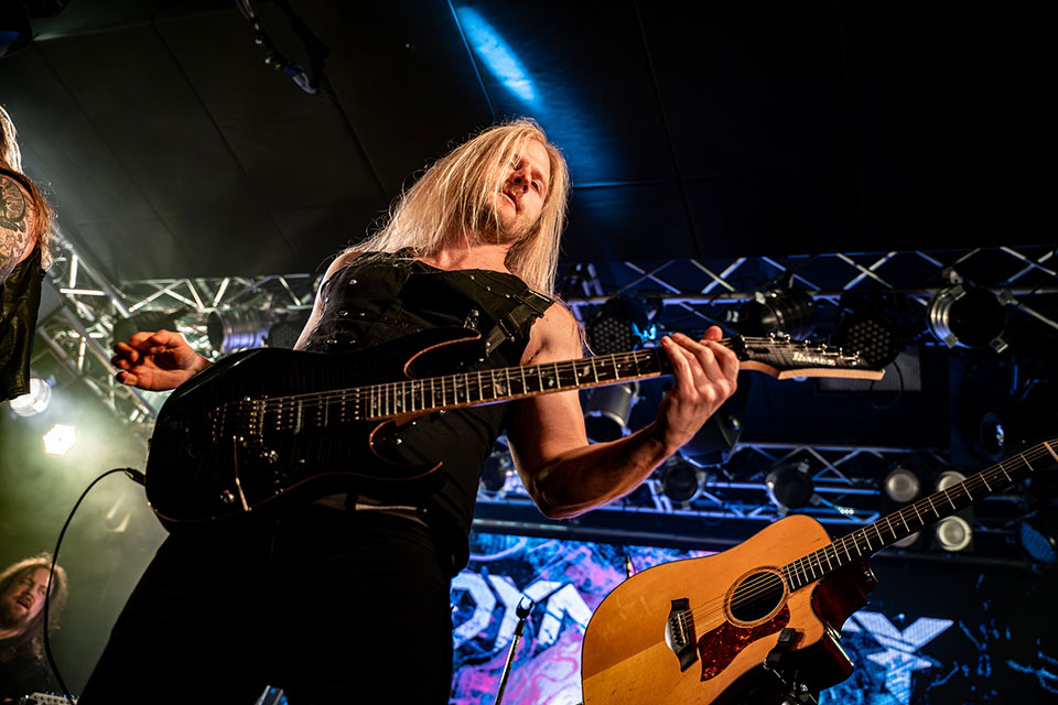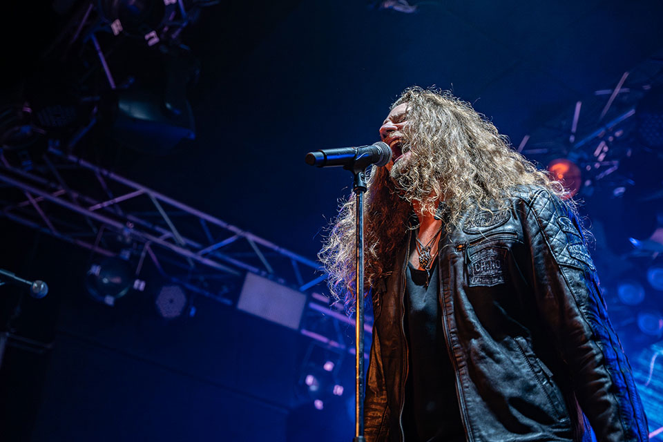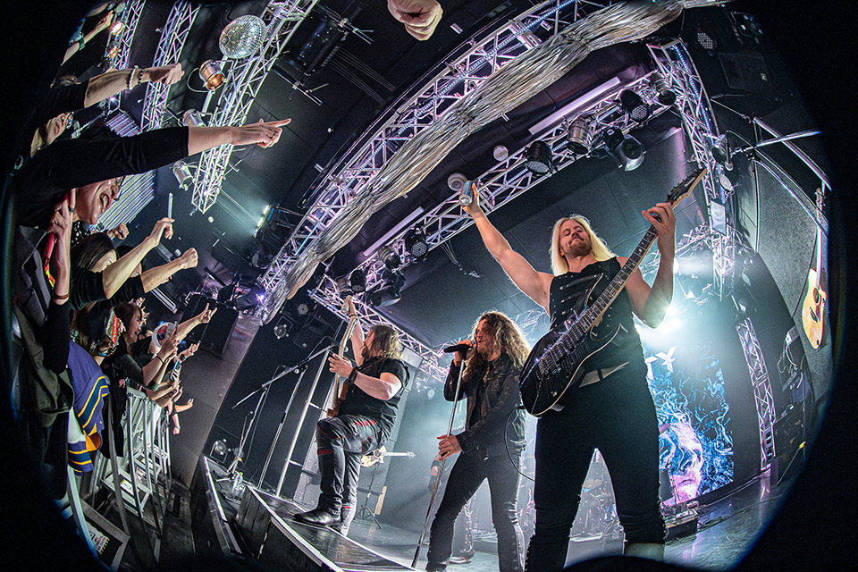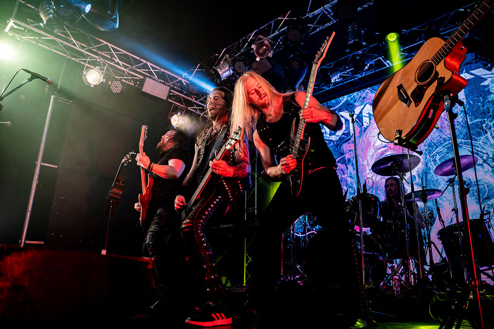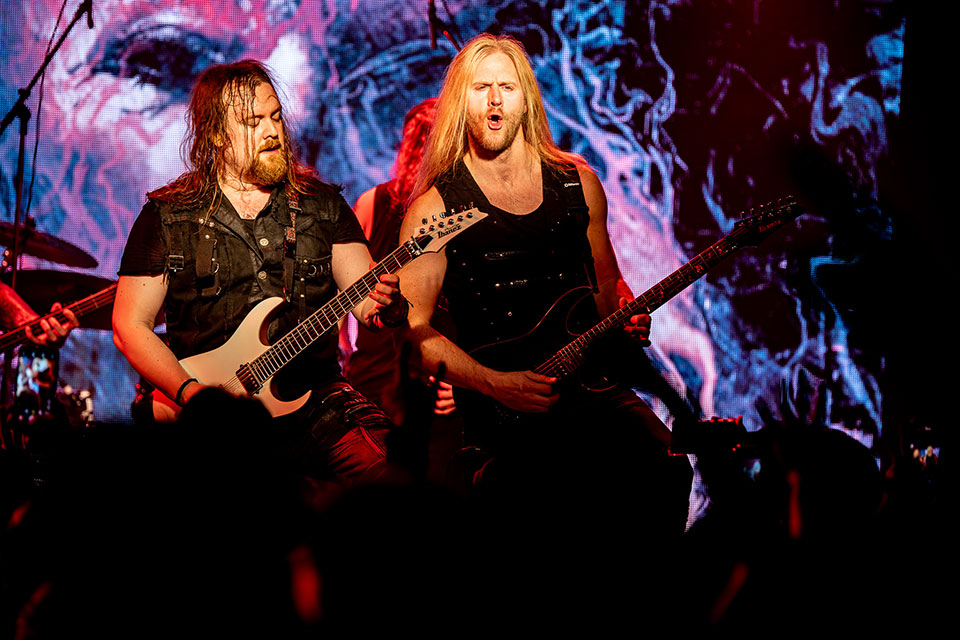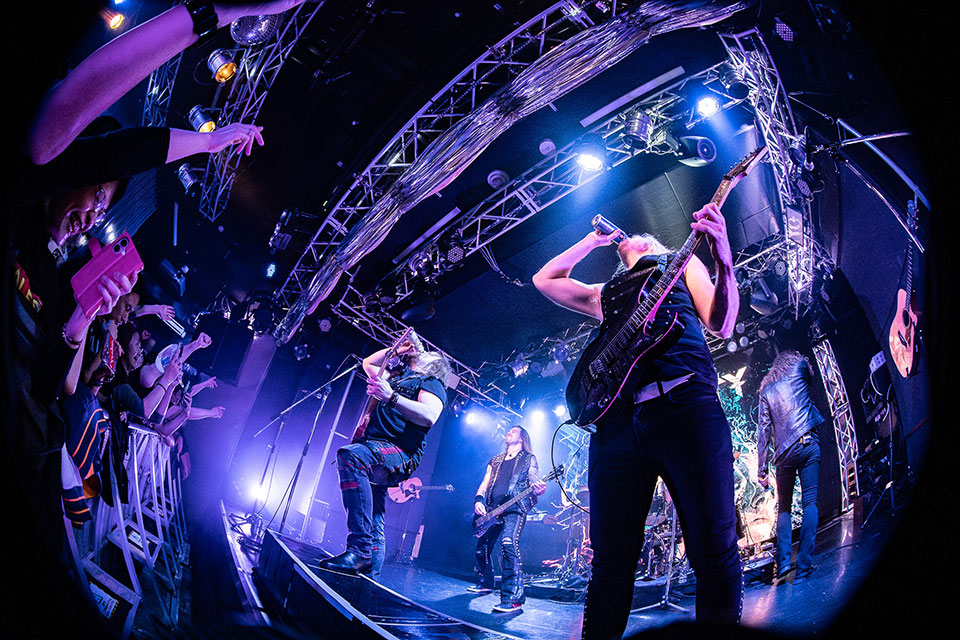 19時16分、開演予定時刻(都心の会場ではなかったからか、19時15分とやや遅めに設定)を少しだけ過ぎて暗転すると、荘厳なSEに導かれ、まずは楽器隊がバラバラと登場。幕開けを飾ったのは、'20作『THE DARK DELIGHT』の表題曲だったが、これはイントロのみで、『FIRESIGN』('18)収録の「In The Arms Of A Devil」がそれに続くと、フロントマンのニルスが歌入り直前にステージ中央へ飛び出してくる。てっきり最新アルバム『GAME OF FACES』('25)収録曲でスタートかと思ったら、まさかの旧作から。しかし、満員のオーディエンスは意に介すことなく、みんな腕を振り上げ、ニルスが煽ると、すかさず「ヘイ! ヘイ!」と叫び、手拍子を促すと全員でそれに応える。続けて『GAME OF FACES』からタイトル・ナンバーが炸裂すると、「待ってました!」とばかりにフロアのテンションはさらにアップ! その反応の良さにメンバー達も満足気だ。