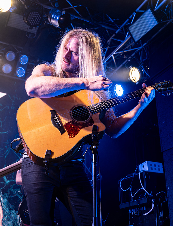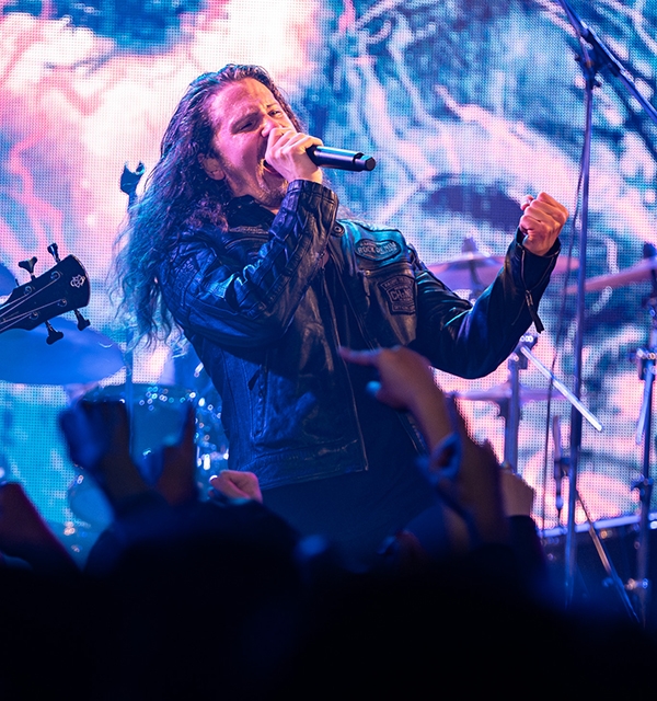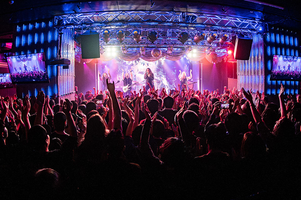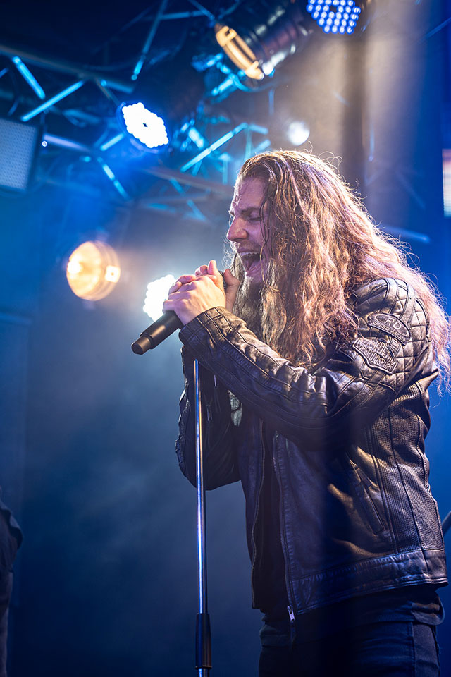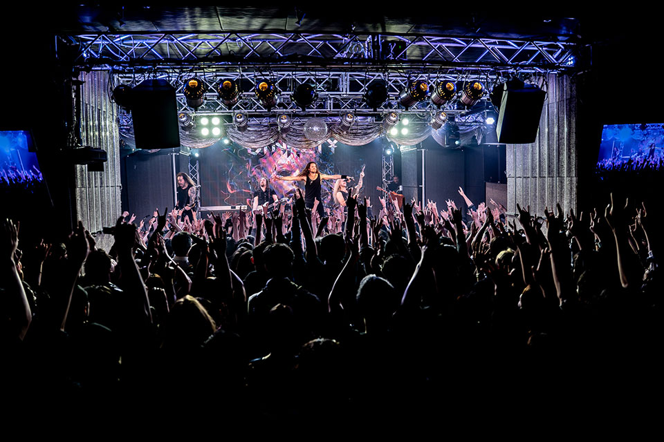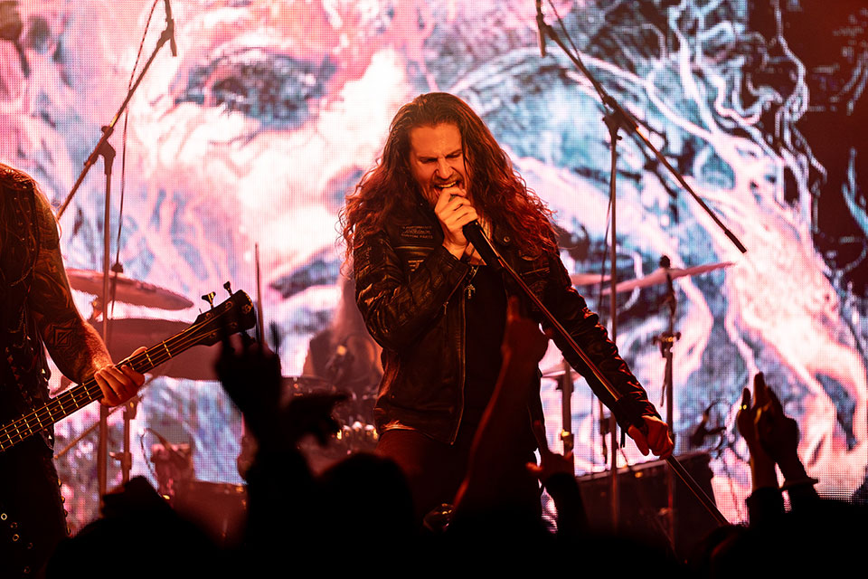 19時16分、開演予定時刻(都心の会場ではなかったからか、19時15分とやや遅めに設定)を少しだけ過ぎて暗転すると、荘厳なSEに導かれ、まずは楽器隊がバラバラと登場。幕開けを飾ったのは、'20作『THE DARK DELIGHT』の表題曲だったが、これはイントロのみで、『FIRESIGN』('18)収録の「In The Arms Of A Devil」がそれに続くと、フロントマンのニルスが歌入り直前にステージ中央へ飛び出してくる。てっきり最新アルバム『GAME OF FACES』('25)収録曲でスタートかと思ったら、まさかの旧作から。しかし、満員のオーディエンスは意に介すことなく、みんな腕を振り上げ、ニルスが煽ると、すかさず「ヘイ! ヘイ!」と叫び、手拍子を促すと全員でそれに応える。続けて『GAME OF FACES』からタイトル・ナンバーが炸裂すると、「待ってました!」とばかりにフロアのテンションはさらにアップ! その反応の良さにメンバー達も満足気だ。