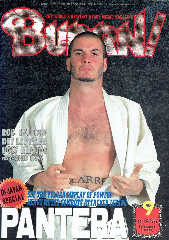 こちらの1992年9月号表紙に使われているのも、小嶋さんの手によるものです。「VULGAR DISPLAY OF POWER」を引っ提げて初来日したPANTERAのフィリップ・アンセルモ(BURRN!初表紙)に柔道着を着せるという、クレイジーな撮影プラン。フィルも「柔道っていうのは日本の伝統スポーツだから、何も知らない人間が着るのはダメだ」と気を遣っていたそうですが、「いざ着せたら喜んでた」ということで、ずいぶんと仲良くなってしまったようです。