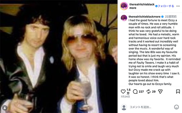 おそらく誰もがオジー・オズボーンの訃報だと思ったことでしょうが、1位はこちらです。オジー絡みであることは間違いありません。レジェンドがレジェンドに贈る追悼の言葉。リッチーのあまり知られていないオジー愛は涙ものでした。