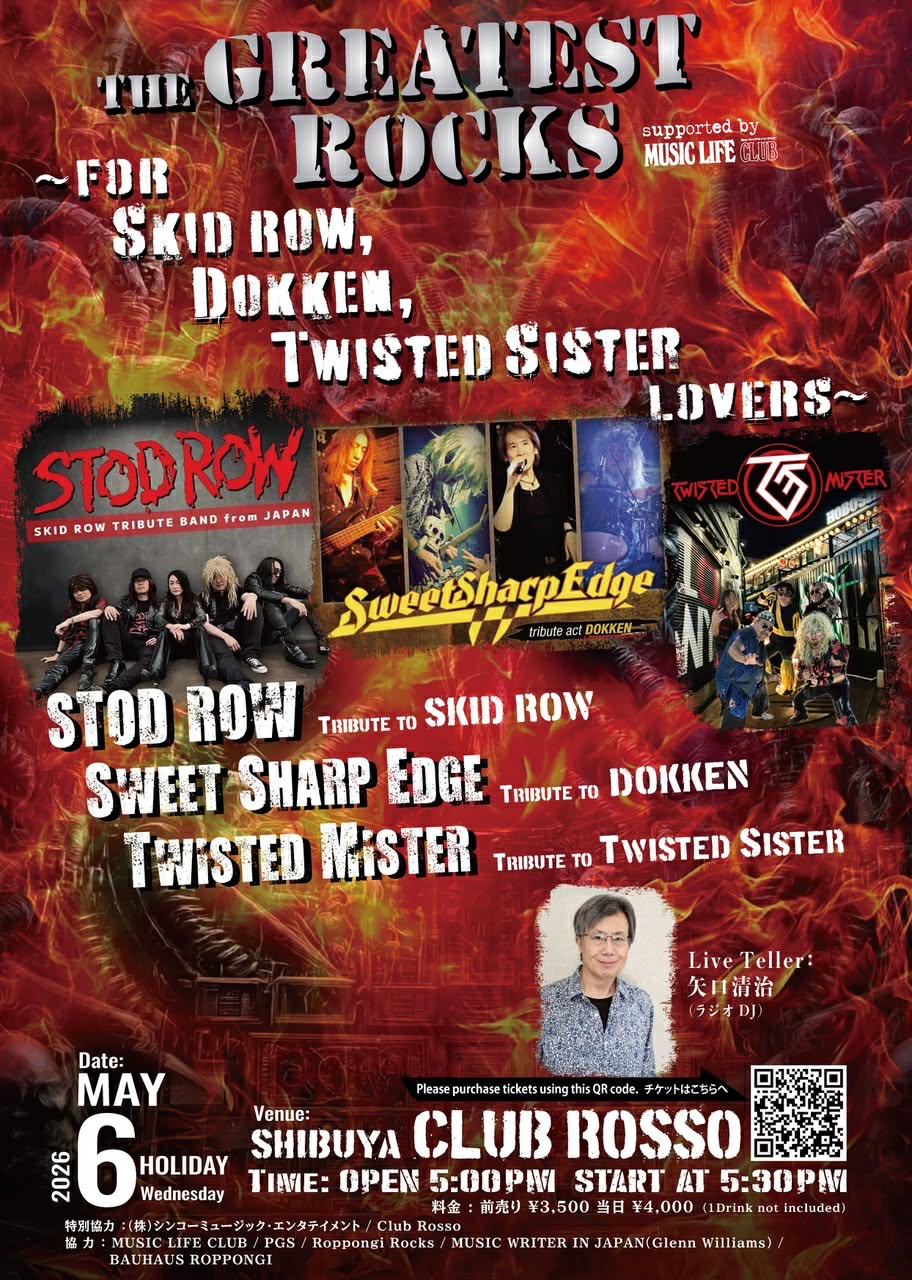 出演は東京・神奈川を中心に積極的に活動する中、その名は全国区になりつつあるスキッド・ロウのトリビュート・バンド「STOD ROW」、実力派「Sweet Sharp Edge」(Tribute to DOKKEN)、そして、トゥイステッド・シスターのトリビュート・バンド「Twisted Mister」は、今回初登場ということで注目です。前日の同会場での“The Greatest Rocks!”(こちらのニュース参照)と同様、ライヴ・テラーとしてラジオ番組「全米トップ40 the 80's」のナビゲーターである矢口清治さんが登壇します。ぜひ、ご来場ください。