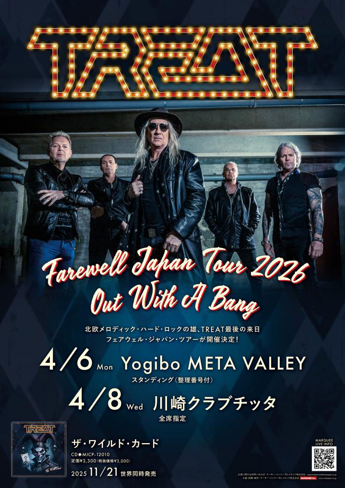 11月21日に10作目のスタジオ・アルバム「THE WILD CARD」をリリースする、スウェディッシュ・メロディック・ハードの大御所TREAT。その彼らが2026年に大阪・神奈川にて来日公演を行なうことが決定した。2018年10月以来となる今回の来日、なんとフェアウェル・ジャパン・ツアーとのこと…。
