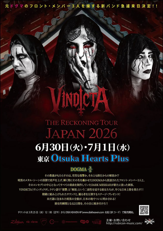 暗黒のメタル・シーンの深淵で産声を上げ、瞬く間にその名を轟かせたDOGMAから放逐されたフロント・メンバー3人と、そのコンセプトの中心となってすべての楽曲を制作していたDARK MESSIAHが新たに放った刺客、VINDICTA(ヴィンディクタ)。ラテン語で「復讐」と「解放」という二面性を冠する彼女たちが、早くも日本上陸を果たす!!